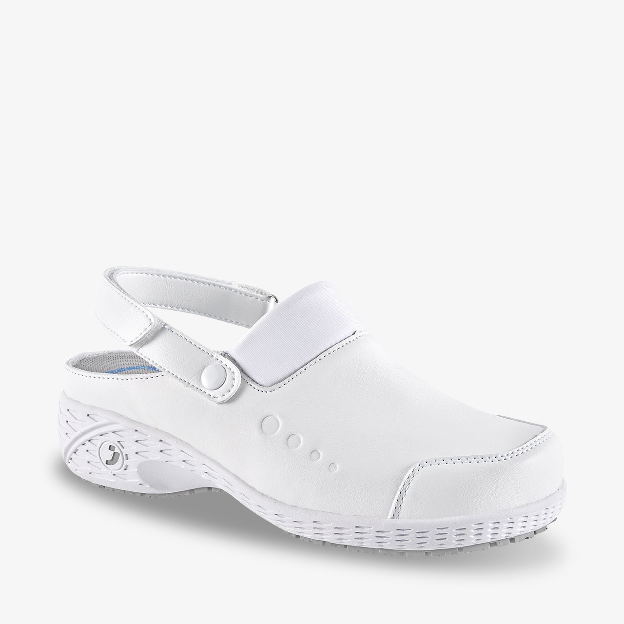 SHEILA bele klompe – udobna in varna profesionalna obutev z ESD zaščito. Zračne, lahke in vegan-friendly, z anatomsko oblikovanim odstranljivim vložkom in nedrsečim podplatom.