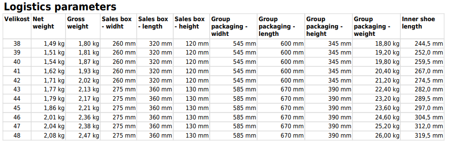 | Velikost | 36, 37, 38, 39, 40, 41, 42, 43, 44, 45, 46, 47, 48, 49 |