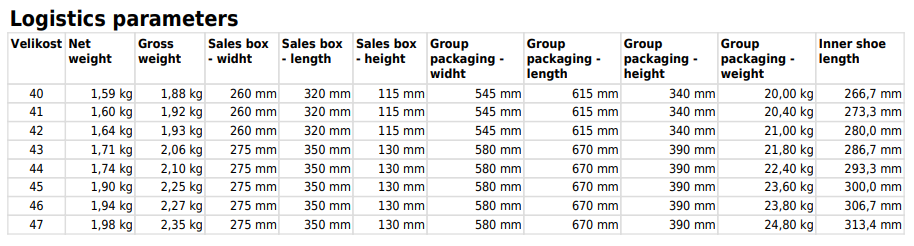 | Velikost | 36, 37, 38, 39, 40, 41, 42, 43, 44, 45, 46, 47, 48, 49 |