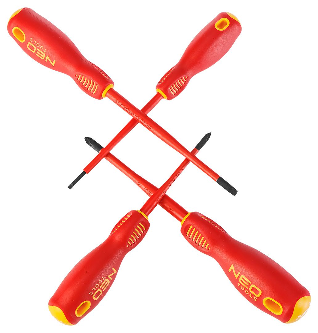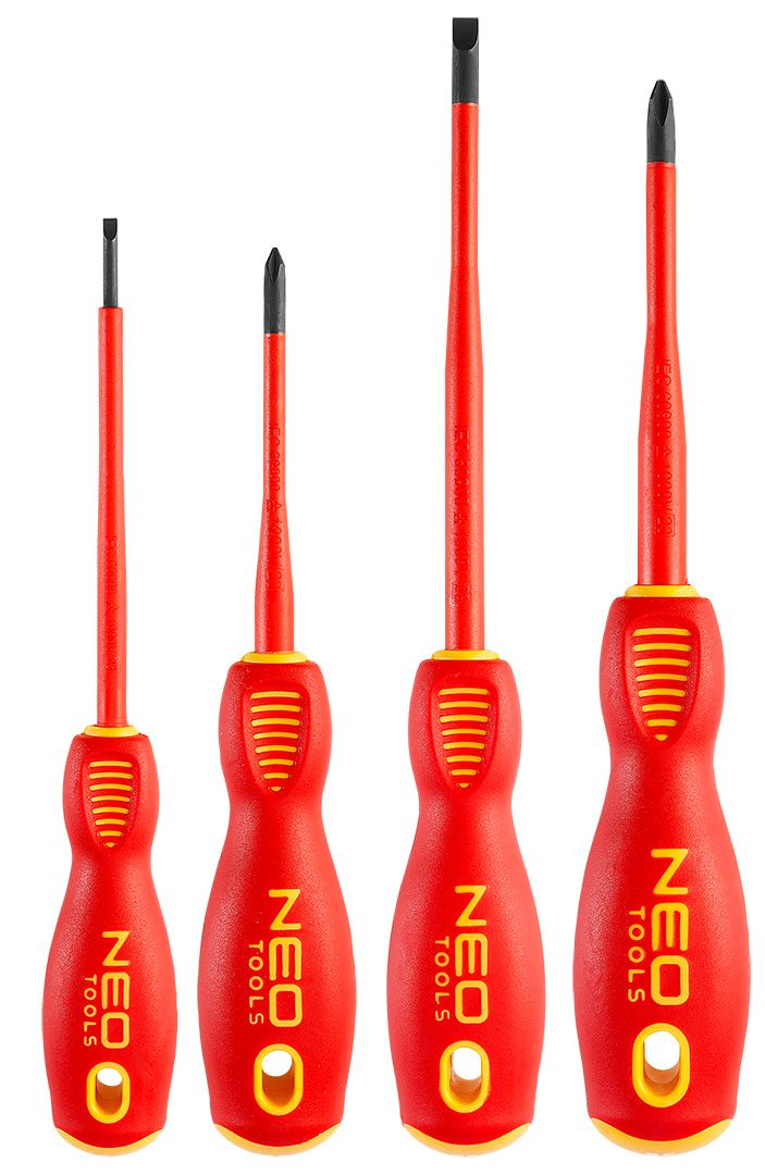 Set izvijačev 1000V, 4 kosi, slim, model 04-144 NEO je nujen za vse električarje, ki potrebujejo varno orodje za delo pod napetostjo do 1000 V. Izdelani so iz trpežnega jekla S2 in imajo konice, ki so toplotno obdelane za večjo trdnost in odpornost proti upogibanju.